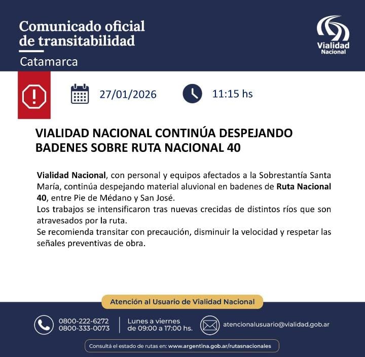 Vialidad Nacional, a través de personal y equipos pertenecientes al Departamento Santa María, continúa desarrollando trabajos de despeje de material aluvional en distintos badenes de la Ruta Nacional N.º 40, en el tramo comprendido entre Pie de Médano y San José. Las tareas se reforzaron en las últimas horas a raíz de las nuevas crecidas […]