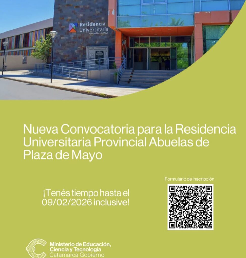 La Residencia Universitaria Provincial “Abuelas de Plaza de Mayo” anunció una nueva convocatoria destinada a estudiantes del interior de Catamarca que deseen iniciar o continuar estudios universitarios en la capital.