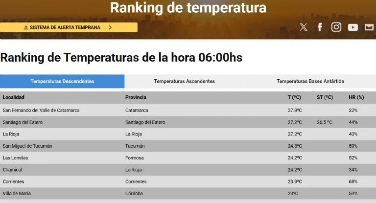 El Sistema de Alerta Temprana posicionó a la ciudad en el primer lugar del listado, seguida por Santiago del Estero y La Rioja, ambas con 27,2°C. Más atrás se ubicó San Miguel de Tucumán, con 24,3°C, completando así el grupo de las jurisdicciones que amanecieron con temperaturas inusualmente elevadas.