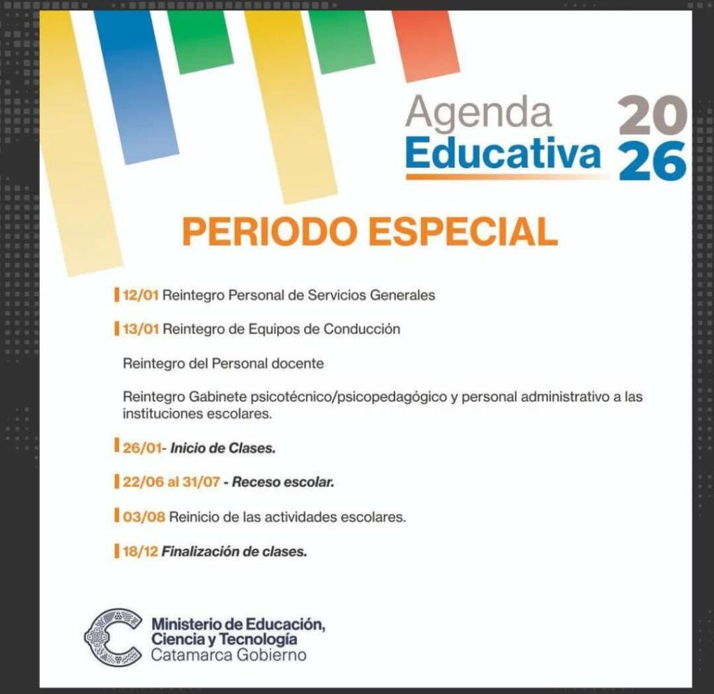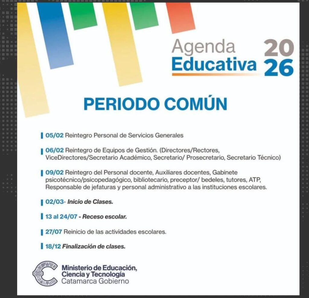 El Ministerio de Educación de Catamarca oficializó la Agenda Escolar 2026, que establece las fechas clave para todos los niveles y modalidades del sistema educativo provincial.