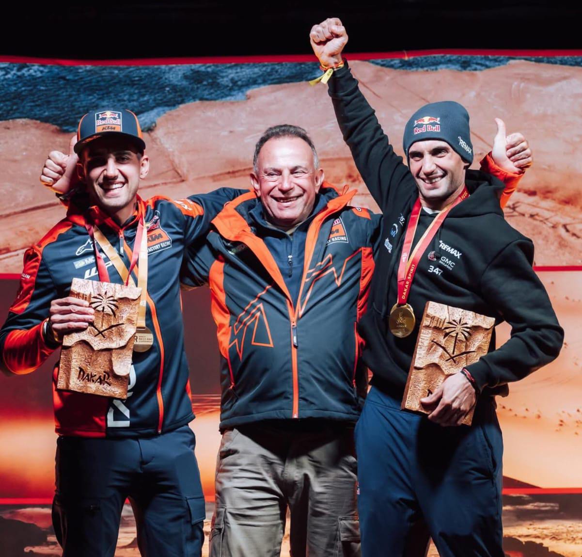 Luciano Benavides (KTM) dominó en motos, reafirmando su candidatura al título. El menor de los Benavides, de 30 años, ganó la etapa entre Riad y Wadi Ad-Dawasir (462 km cronometrados y 414 de enlace), y aunque se mantiene tercero en la general, acortó distancias con el líder, el australiano Daniel Sanders.