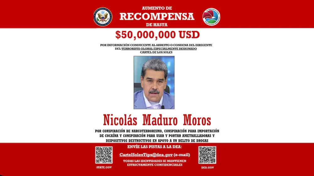 Estados Unidos duplicó el 7 de agosto la recompensa por información que llevara a la captura o condena de Nicolás Maduro, elevándola a 50 millones de dólares. La medida, comunicada por el Departamento de Estado y el Departamento de Justicia, formó parte de una estrategia de presión internacional contra el régimen venezolano, y su líder, acusado de violar leyes federales de narcóticos y de encabezar una organización criminal transnacional.
