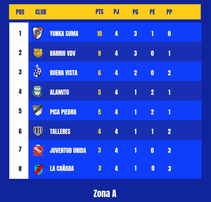 - Zona A: el duelo estelar será entre Yunka Suma y El Barrio, primero contra segundo, en un choque que puede definir la punta de la tabla. Actualmente, Yunka Suma lidera la zona con firmeza.