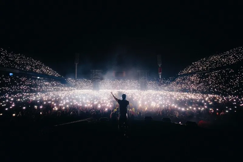 Uno de los momentos más emotivos llegó cuando el artista se trasladó a un escenario secundario en el centro del campo, donde ofreció un set acústico íntimo en medio del estadio repleto. Entre luces cálidas y aplausos, interpretó versiones especiales de sus canciones más sentidas, generando un clima de cercanía con el público.