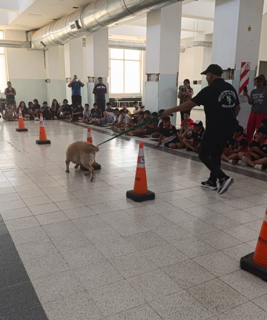 Al cierre de la jornada, los estudiantes pudieron presenciar una demostración a cargo de la can “Frida”, donde se exhibió parte del trabajo que realizan los perros adiestrados en operativos y procedimientos oficiales, así como la disciplina y entrenamiento que reciben diariamente.