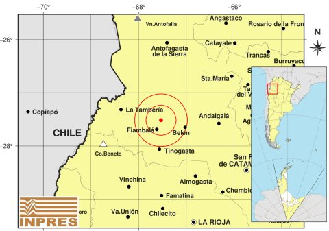 El movimiento telúrico ocurrió a las 04:36:25 (hora local) y tuvo su epicentro ubicado a 51 kilómetros al oeste de Belén, 61 kilómetros al norte de Tinogasta y 85 kilómetros al sur de Culampajá, con coordenadas -27.519 de latitud y -67.53 de longitud.