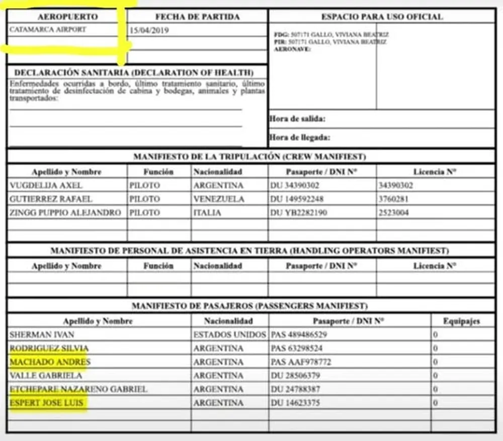 Según consta en la documentación que la Policía de Seguridad Aeroportuaria y la Administración Nacional de Aviación Civil (ANAC) aportaron a la causa judicial, en el caso del vuelo a Catamarca partieron del aeropuerto provincial con destino al aeropuerto de San Fernando, en la provincia de Buenos Aires.